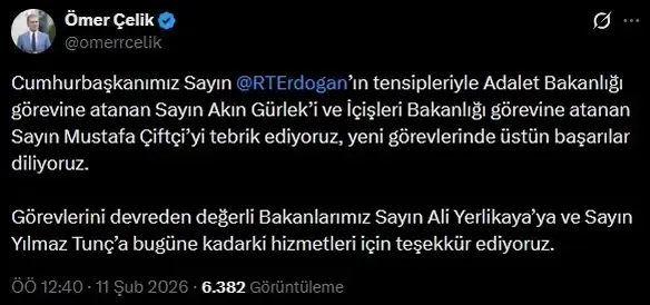 AK Parti Sözcüsü Ömer Çelik de sosyal medya hesabından yaptığı açıklamada, yeni atamaların hayırlı olmasını temenni etti. Çelik, Cumhurbaşkanı Erdoğan’ın tensipleriyle Adalet Bakanlığı görevine atanan Akın Gürlek ile İçişleri Bakanlığı görevine atanan Mustafa Çiftçi’yi tebrik ederek, yeni görevlerinde başarılar diledi. Çelik, görevlerini devreden Ali Yerlikaya ve Yılmaz Tunç’a da kamuoyuna yansıyan hizmetleri dolayısıyla teşekkür etti.