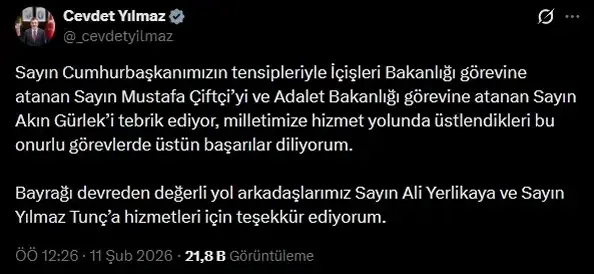 Cumhurbaşkanı Yardımcısı Cevdet Yılmaz, sosyal medya hesabından yaptığı paylaşımda, Cumhurbaşkanı Recep Tayyip Erdoğan’ın tensipleriyle gerçekleştirilen atamalara ilişkin değerlendirmede bulundu. Yılmaz, Mustafa Çiftçi ve Akın Gürlek’e yeni görevlerinde başarılar dileyerek, “Milletimize hizmet yolunda üstlendikleri bu onurlu görevlerde üstün başarılar diliyorum” ifadelerini kullandı. Yılmaz ayrıca, görevlerini devreden İçişleri Bakanı Ali Yerlikaya ile Adalet Bakanı Yılmaz Tunç’a da bugüne kadar verdikleri hizmetler için teşekkür etti.